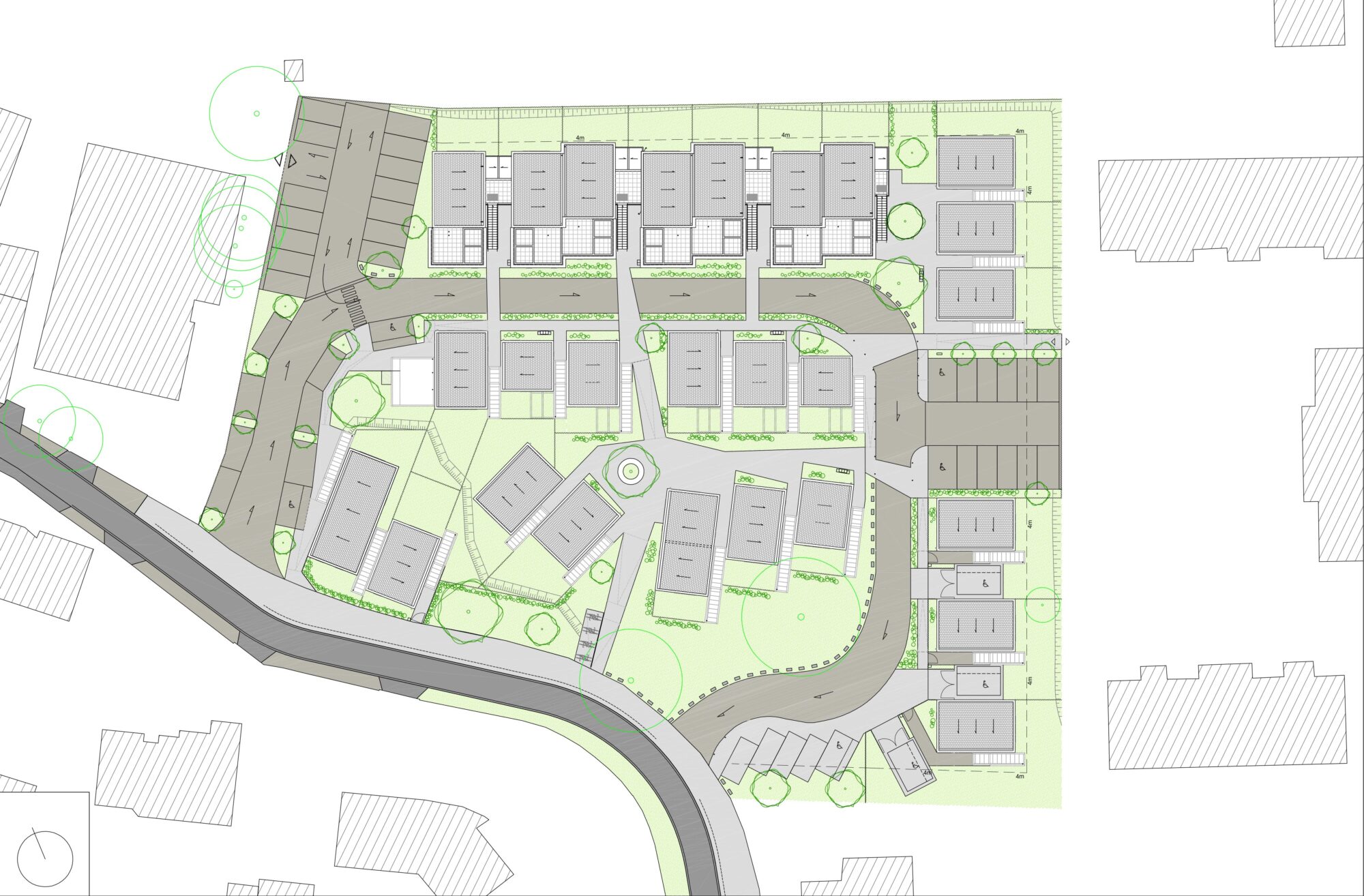 Cette dernière est régulièrement recoupée par le réseau de circulations piétonnes, majoritaire et prioritaire, qui relie toutes entrées aux placettes, aux locaux communs et aux espaces verts accessibles à tous.